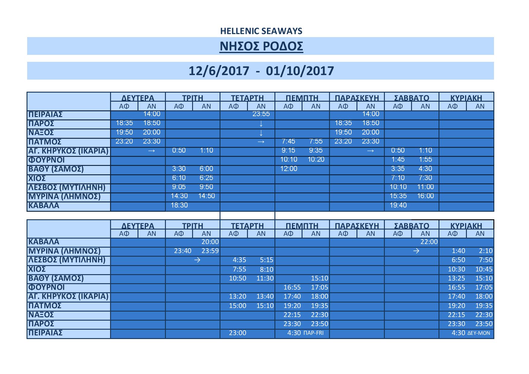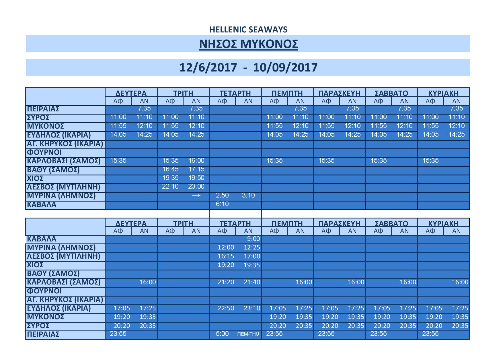 1) Δρομολόγια για το πλοίο ΝΗΣΟΣ ΜΥΚΟΝΟΣ από Πειραιά, Σύρο, Μύκονο, Φούρνους, Καρλόβασι (Σάμος), Βαθύ (Σάμος), Χίο, Μυτιλήνη, Λήμνο και Καβάλα για Ικαρία από 12/06/2017 έως 10/09/2017.